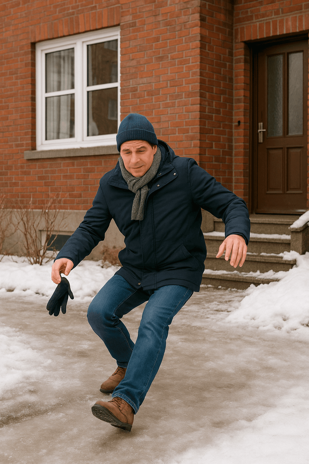 1️⃣ Winterliche Glätte auf dem Gehweg: Ein Passant rutscht auf einem nicht gestreuten Gehweg aus und bricht sich das Bein – der Eigentümer haftet für die Behandlungskosten.
